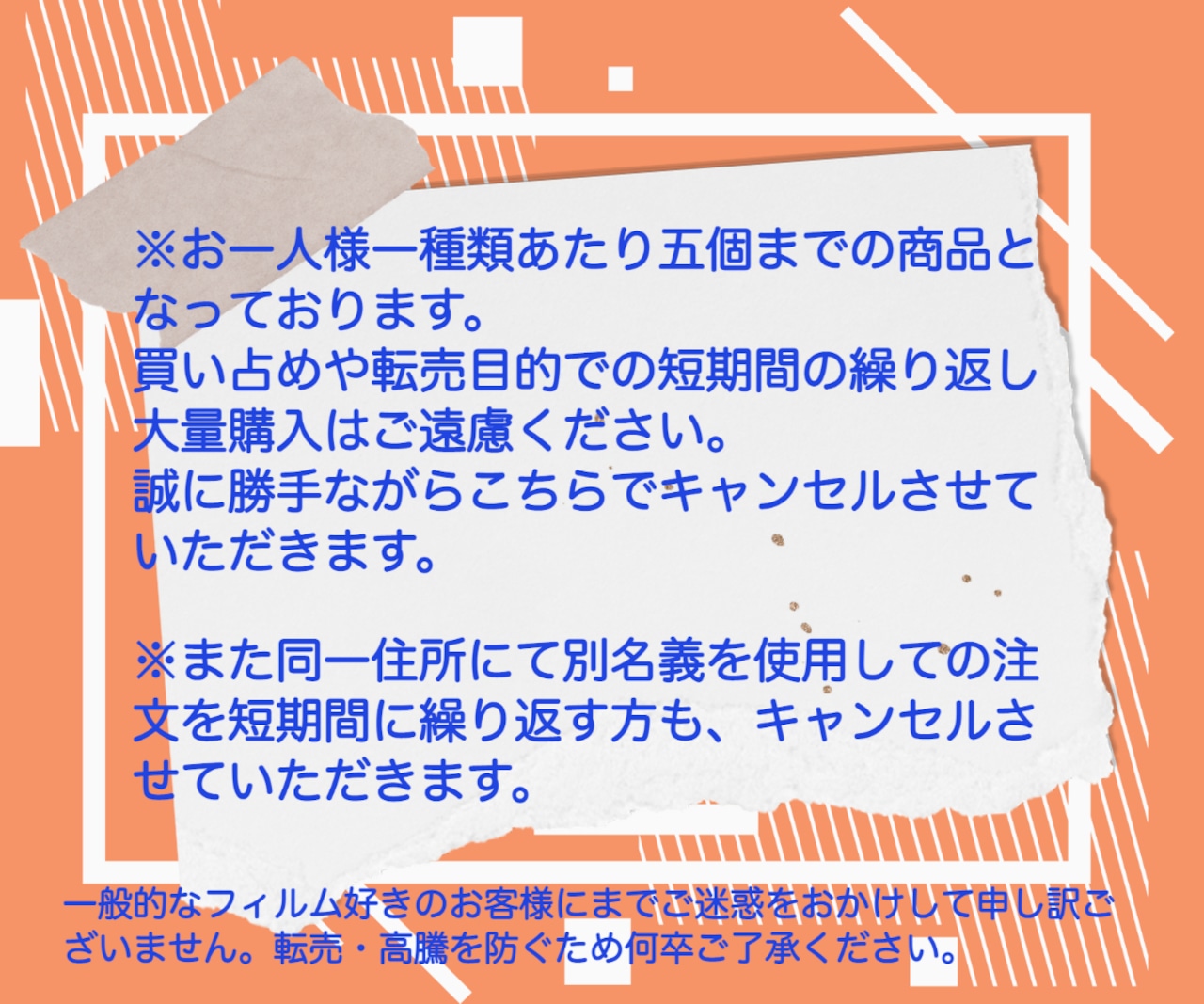 買い占めや転売目的での短期間の繰り返し大量購入はご遠慮ください。